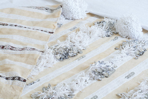 wedding blanket, also called Handira are known in modern design for their beautiful bohemian style and neutral colour palette. They are used as bed covers, wall hangings, sofa coverings, throws, tablecloths, and more. Handira is woven out of sheep's wool, cotton and linen Berber women in the Middle Atlas mountains. Each blanket can take weeks to make.